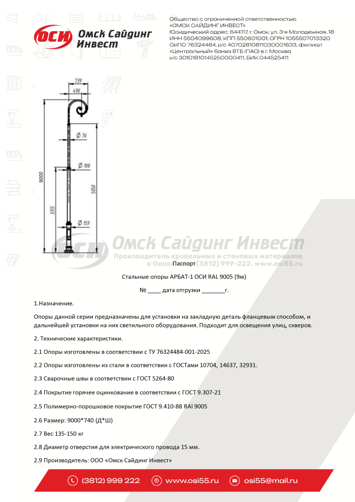 Опора фонарная ОСИ Арбат-1 декоративная однорожковая с монтажной панелью, без закладной и светильника. Опоры данной серии предназначены для установки на закладную деталь фланцевым способом и дальнейшей установки на них светильного оборудования. Подходит для освещения улиц, скверов, парков. Выполнена из трубы круглой 159; 108; 89; 76; 40; переходов на трубы; трубы профильной 30*20; проволоки 3мм; листа г/к 16мм; 5мм; листа х/к 1 мм; декоративных элементов. В комплекте метизы М20. Высота 9м. Покрытие горячее оцинкование; порошково-полимерное в цвет: RAL 9005.