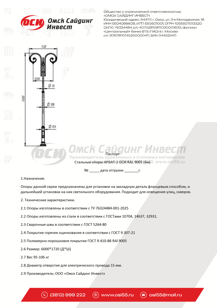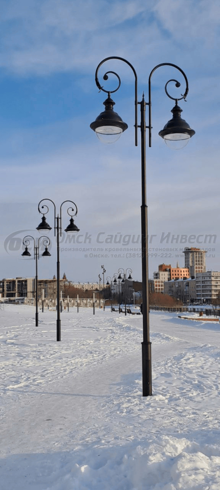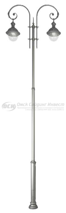 Опора фонарная ОСИ Арбат-2 декоративная двухрожковая с монтажной панелью, без закладной и светильника. Опоры данной серии предназначены для установки на закладную деталь фланцевым способом и дальнейшей установки на них светильного оборудования. Подходит для освещения улиц, скверов, парков. Выполнена из трубы круглой 159; 108; 89; 76; 40; переходов на трубы; трубы профильной 30*20; проволоки 3мм; листа г/к 16мм; 5мм; листа х/к 1 мм; декоративных элементов. В комплекте метизы М20. Высота 6м. Покрытие горячее оцинкование; порошково-полимерное в цвет: RAL 9005.